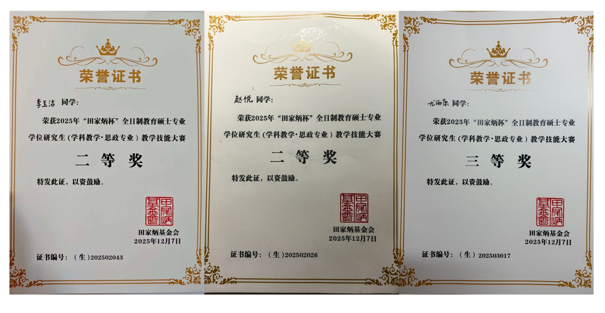 2025年12月5日至7日,由江西师范大学主办、田家炳基金会冠名支持的2025年全国“田家炳杯”全日制教育硕士专业学位研究生(学科教学·思政)教学技能大赛决赛在江西师范大学瑶湖校区圆满落幕。我校马克思主义学院2024级学科教学(思政)专业研究生赵悦、李玉洁荣获二等奖,尤雨康同学荣获三等奖,指导教师何光辉、刘英荣获优秀指导教师奖。
