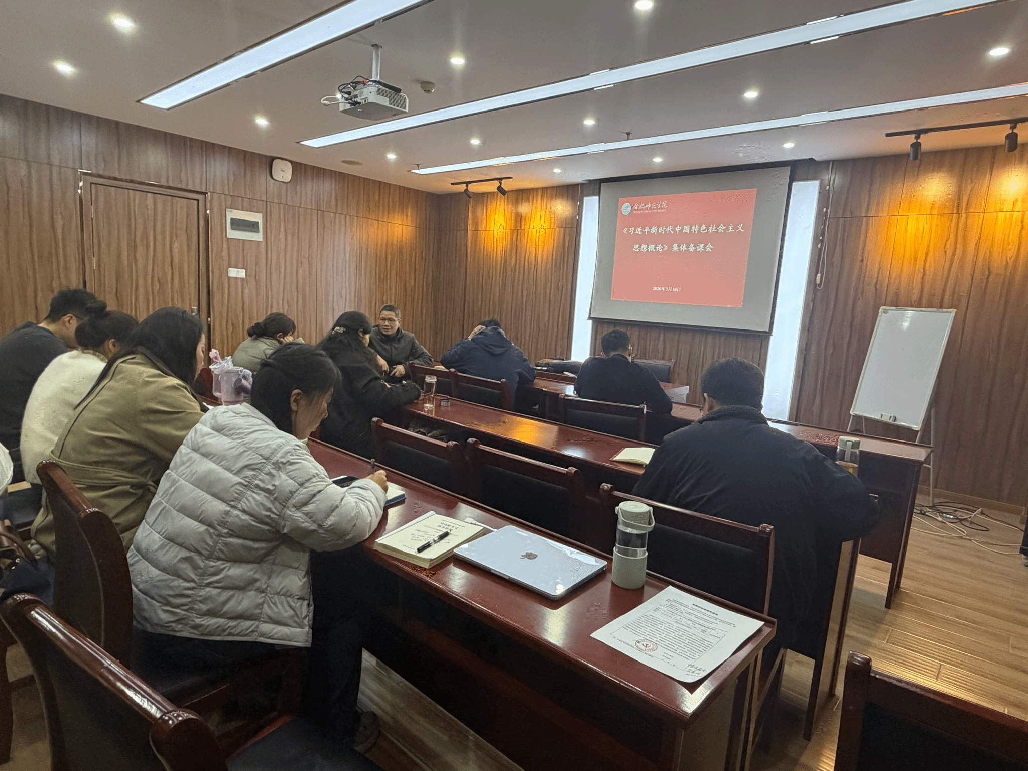 教研室全体教师围绕“习近平总书记在安徽”思政公开课课程建设的专题设计、实施进度、人员分工等关键问题展开热烈研讨;并针对课程建设中可能出现的案例阐释、理论解读以及教学中遇到的教学难点、方法创新、学情把握等问题进行了深入交流研讨。各位教师分享教学经验、探讨解决路径,在思想碰撞中凝聚教学智慧。